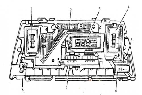 圖3數(shù)字式車速表1燃油表;2轉(zhuǎn)速表;3車速表;+溫度表;5蜂鳴器;6車速報(bào)警燈;7車速傳感器;8放大顯示開關(guān)