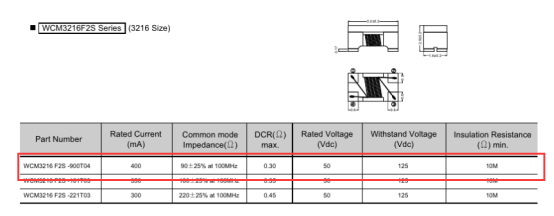 WCM3216系列貼片共模電感的參數:90Ω的阻抗、400mA的額定電流、0.3Ω的直流電阻。